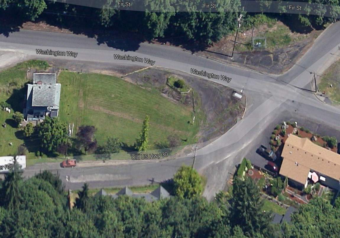 Current location, now an empty lot, from above looking Northwest (from Google Maps March 1, 2015). The Texaco Service Station once stood across the highway to the East (right side of the photo). |