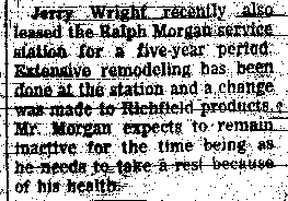 Ralph Morgan operated the Richfield Station in the 1960s. When it opened or closed is not known at this time. He was married to Alice Irene Morgan. She taught at the Rainier Elementary School from 1962 to 1987. They had two children, Jim and Kay.