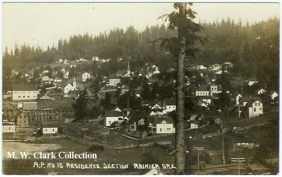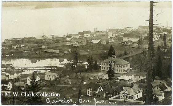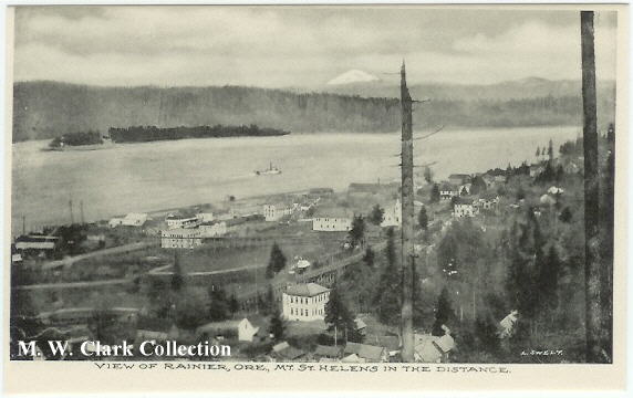 "VIEW OF RAINIER, ORE., MT. ST. HELENS IN THE DISTANCE." |