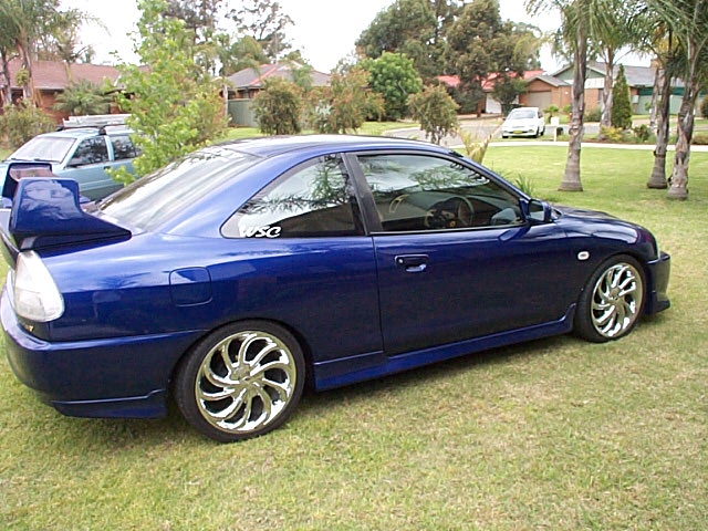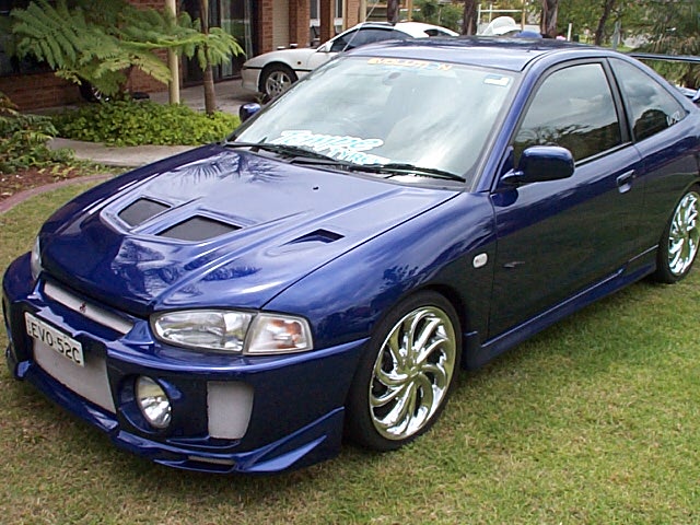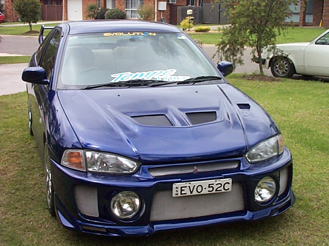 | This here is Jason's 97 MR Lancer. Originally this was Jason's parents car but they gave him the car when they decided to buy another. Jason got the car with only 15,000km's on the clock and not a single blemish on the paintjob, of course Jason didnt get the car the way you see it here. In the beginning it was a dead stock MR with "sexy" 13" rims Jason ditched these for 16" ALT rims now the car rides on 17" Twister rims from the guys at Tempe Tyres. When it came time to change the body aspect of the car Jason decided on going with the Evolution 5 kit that u see here. |