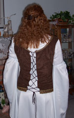 | For the back of the dress, we decided not to go with a zipper, but to make lacing. In the real dress, Eowyn wears both a vest and a corset over it. I'm afraid time did not allow me to make the corset. So, we did the next best thing. The corset is laced and so we laced the back. I actually like it a whole lot. I think it is really pretty. And since the movie never shows the back of Eowyn's Shield Maiden dress, you can do whatever you want and no one knows the difference! (Except obssessed costumers like myself!) | ||||||||||||||||||||||||||