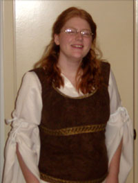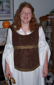 | I made this costume from the pattern Simplicity 4940. What is nice about this pattern is that it is so very close to Eowyn's Shield Maiden dress. My mom and I made only a few modifications. First, the yoke was designed higher in the pattern that Eowyn's. We had to cut it down a bit, but it was not difficult. Second, the bodice is shorter than Eowyn's. We added length at the waist (about three inches) to make the bodice longer. Third, the bodice does not have caps like Eowyn's does. We have not added them yet. I am going to be having an ROTK EE party and I will add them before that time. | ||||||||||||||||||||||||||