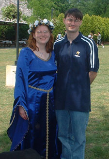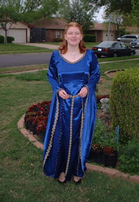 Here I am in my new dress! I modeled this dress after the White Dress of Eowyn from Lord of the Rings. Since I am so pale and wash out when I wear white, I went with a blue color. I used the pattern Butterick 3552, view B. The only thing that had to be changed was the collar. Instead of a straight neck I used a V neck. I also had the help of three lovely people in the process of making this dress. Thanks to Jennie for taking the time to cut all the pieces out with me! Thanks to Dale for all her time spent sewing the dress itself! And thanks especially to my Mom who graciously sewed by hand all the gorgeous trim onto my dress when I was stuck doing homework! You're all lifesavers! |
