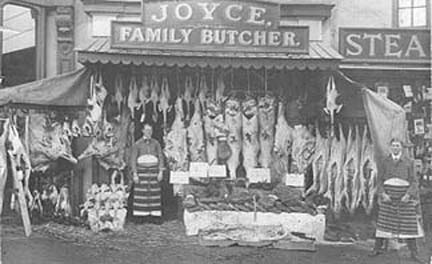 No prizes for hygiene at this Coggeshall butchers shop. It is New Year 1911 and the staff are posed outside the shop of Joyce the butcher on Market End, next to the Post Office. |