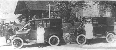 Smith's taxis attend a wedding at St Peter's Church in 1927 with drivers in smart white coats. These vehicles obviously attracted a lot of attention from bystanders, as they would today. |