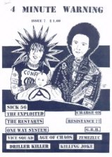 | I've been in contact with Mitch since 1997 she was a regular reader of my paper zine The Suffragette. She then collaborated with me on issue #9 on the Blackpool punk scene. She has been into punk since the early 80's and now writes her own fanzine here in the UK called 4 Minute Warning. ISSUE #7 OUT NOW! �1.60 plus an A4 s.a.e. for more info write to... 31 FIR GROVE, MARTON, BLACKPOOL, LANCS,FY1 6PJ, ENGLAND |