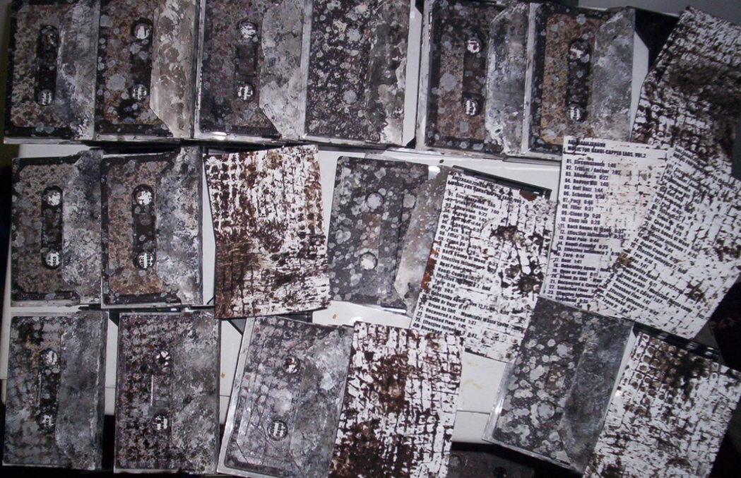 25 tracks of stylistically schizophrenic noise in just under 30 minutes... brief moments of feedback drenched & tortured electronics, extreme walls, cut-up harsh noise, frantic vocal outbursts, industrial atmospheres & mechanical loops, quiet concrete violence. dubbed onto painted, high quality cassettes taken from the local abandoned insane asylum. packaged in cases heavily abused by paint & flame, w/ individually painted double-sided 3"x5" insert. double a-sided c60.