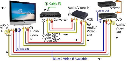 DVD, VCR, TV cable connections to Audio / Video Receiver