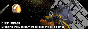 | J'espère avoir le temps de compléter ces informations d'ici peu; en attendant n'hésitez pas à aller faire un tour sur les pages qu'est qu'une comète? et les comètes et la vie sur Terre (si ce n'est déjà fait!) pour avoir un supplément d'information sur l'intérêt de cette mission. Si vous pratiquez la langue de Shakespeare, vous pouvez allez visiter avec profit le site de la NASA consacré à cette mission en tapant http://www.nasa.gov/mission_pages/deepimpact ou en cliquant sur l'image ci-contre -> |