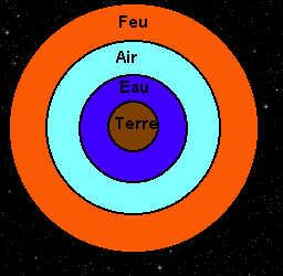 | Originellement, ils auraient été placé les uns sur les autres, dans cet ordre. A la création du monde, ils ont été mélangé, et depuis chacun essaye de retrouver sa place: l'eau tombe du ciel (l'air) pour retrouver sa place dans les océans, au dessus de la terre. Ainsi, Aristote expliquait les comètes comme de simples flammes qui traversent le ciel pour regagner sa place au dessus de l'air. |