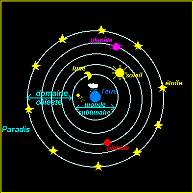 | Pour Aristote la Terre était un corps fixe au centre de l'Univers, autour duquel tournaient la lune, le soleil et les planètes. Cet univers était délimité par une sphère où les étoiles étaient fixées. L'Eglise Catholique ajouta plus tard que le Paradis se trouvait après les étoiles. Ce système est nommé le géocentrisme. Le domaine s'étendant de la Terre à la lune (monde sublunaire) était celui de l'impur et du changeant, tandis qu'au delà de la lune se trouvait un espace pur et figé, où le seul mouvement possible pour les astres était de décrire un cercle parfait à vitesse constante autour de la Terre. |