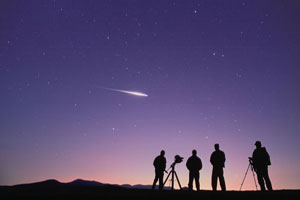 | Les étoiles filantes, ou météorites, sont des petits corps qui rentrent dans l'atmosphère. Sous l'effet des frottements et de la vitesse de leur chute, ils se consument rapidement et brillent. Ils n'ont donc rien à voir avec les comètes, car: 1- ils se trouvent dans l'atmosphère 2- ils sont de très petite taille 3- ils brûlent. Cependant, il y a tout de même un lien entre comètes et météorites. Comme nous l'avons vu, les comètes disperse de grandes trainées de poussières dans l'univers; lorsque l'orbite de la Terre rencontre ces poussières, on assiste alors aux fameuses "nuits des étoiles filantes", périodes où de nombreuses poussières se consument, ce qui est un magnifique spectacle vu de la Terre. Ils existe ainsi de véritables essaims d'étoiles filantes, tel que les Léonides (que la Terre traverse en novembre) qui sont des traces de la queue de la comète 55P/TEMPLE- TUTTLE. |
