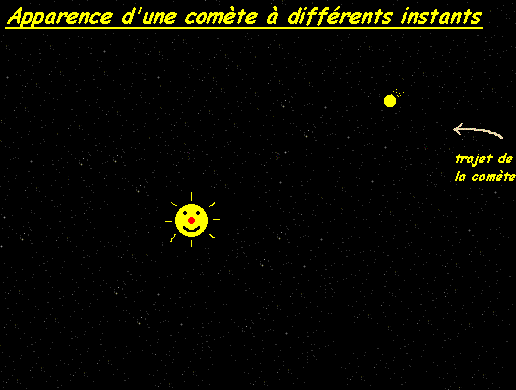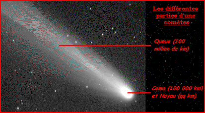 | On peut diviser les comètes en 3 parties: La coma est un nuage de gaz et de poussières qui reste près du noyau, grâce aux forces de gravitation. Elle a un diamètre d'environ 100 000 km. La queue est l'élément le plus impressionnant d'une comète: elle peut atteindre 100 million de km! Etant constituée exclusivement de gaz et de poussières, sa masse est très faible. A cause des vents solaires, elle est toujours dirigée à l'opposé du soleil et devient plus grande près du soleil. |