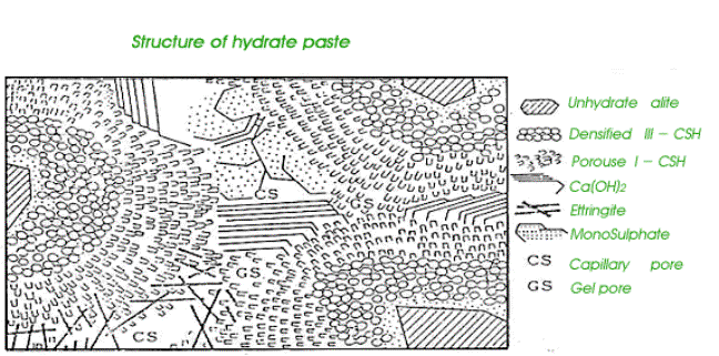 consists of solids (C-H-S, CH, Ettringite, Monosulphate, unhydrated cement) ,