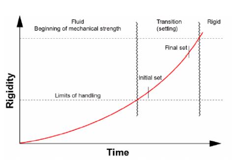 Setting is controlled by the hydration of C3S. The period of good workability is during the dormant period, (stage 2). Initial set corresponds to the beginning of stage 3, a period of rapid hydration. Final set is the midpoint of this acceleration phase. A rapid increase in temperature is associated with stage 3 hydration, with a maximum rate at final set.