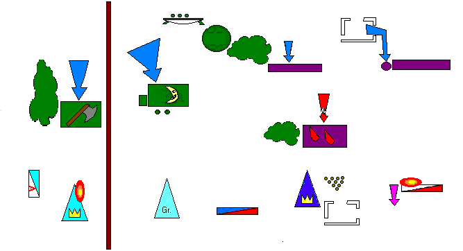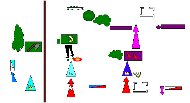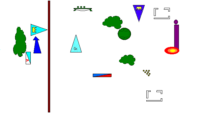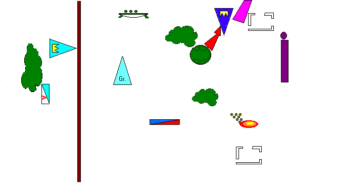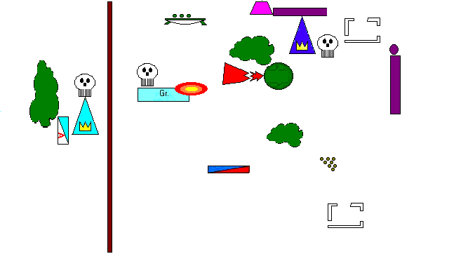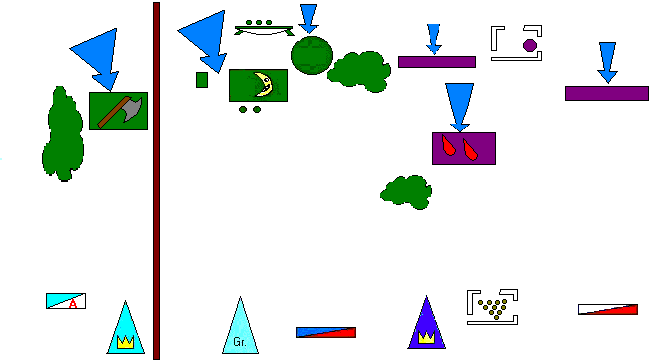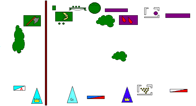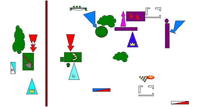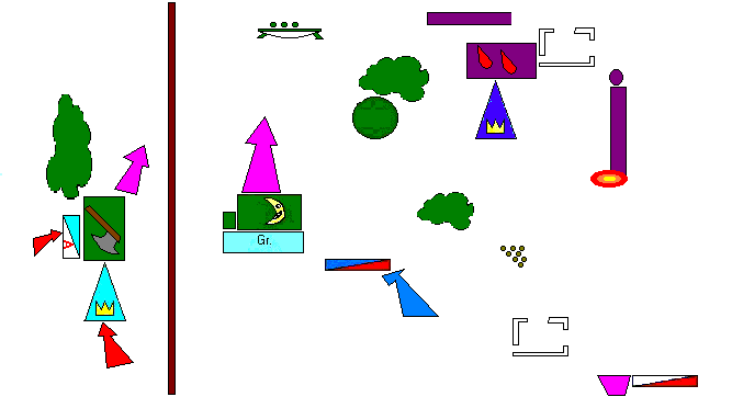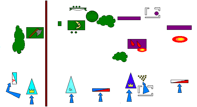 Las ruinas a uno y otro lado del terreno (rectángulos en blanco), ocultaban al Hechicero Elfo Oscuro y a los Hostigadores, y el acantilado (rectágulo en marrón, que parte el terreno en dos), iba a estar ocupado por los Guerreros Orcos Grandotes, los Alabarderos Bretonianos y una pequeña unidad de Caballeros; el control de esa zona tenía una gran importancia estratégia pues en caso de empate o derrota no decisiva, los puntos que proporcionaban los cuadrantes iban a resultar fundamentales en el resultado final.
