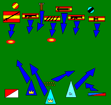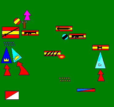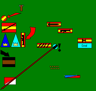Los movimientos estaban claros en la mente de todos... si no fuera porque los vasconi aparecían en pleno flanco derecho, como por sorpresa, bloqueando prácticamente la visión de los arqueros de Haro y dejando a los Caballeros del Reino envueltos en una refriega terrible, cargados también ahora por los fusileros... El cañón, gracias al liderazgo del general Mercenarios, se recompuso y volvió a la acción y éste, por su parte, custodió la retaguardia de los Caballeros, dispuesto a flaquearlos y atacar al enemigo tan pronto pudiera.