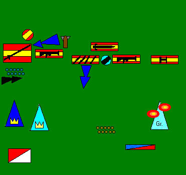 A pesar de que el despliegue no fue fundamental a la hora de decidir el resultado final, lo cierto es que ambos Generales coincidimos en que el cañón ligero, situado entre grandes bloques de tropas, poco o nada pudo hacer, lo que supuso una buena cantidad de puntos desaprochados en una retaguardia inútil.