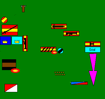 Una fase, por otra parte, exitosa para Bretonia, al menos en el flanco izquierdo: Los Guerrilleros fueron aplastados bajo los cascos de los corceles bretonianos, y la fuerza de la carga los llevó a topar contra la Caballería Mercenaria, con la que se medirían en la siguiente ronda de combate; por si esto fuera poco, el cañón, inútil hasta entonces, dio media vuelta junto con su dotación y se marchó en dirección a Bilbali... En el flanco derecho, las cosas no pintaban tan bien: A pesar de que los Caballeros del Grial obtuvieron 2 bajas, recibieron otra (¡3 bajas en solo dos turnos!), y gracias a la superioridad numérica y las filas de los Herreruelos (¡si la batalla se hubiera celebrado hoy, con las nuevas reglas, otro gallo hubiera cantado!. Sobre todo porque ninguno de ambos recordamos que la "caballería ligera" no suma filas...), el resultado del combate fue un simple empate... ¡lo que supuso perder la formación en cuña!.