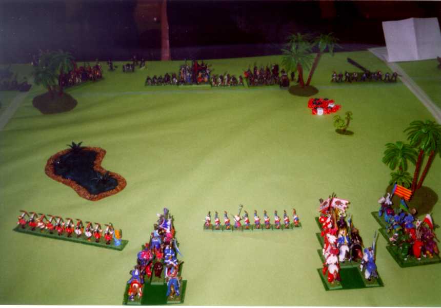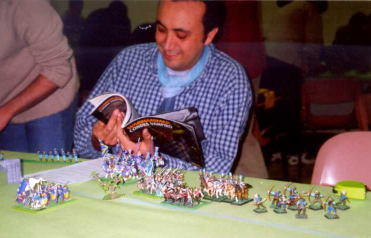 Duelos muy atractivos en la primera ronda, donde los Generales comenzaban a disfrutar de la numerosísima escenografía y de los tableros de juego (hubo quien, no sin razón, echó a faltar unos cuantos más centímetros cuadrados... ¡Angel Andrés Ortega traía consigo más de 170 miniaturas, entre Zombies y Esqueletos, y las 4 unidades de 36 Goblins Nocturnos de Ismael Roig estaban muy apretaditos en la zona de despliegue!). La impresión general era fantástica, las dos tiras de mesas daban para toda clase de cábalas acerca de la calidad de las figuras, de los resultados de las batallas y de lo bien que se lo iba a pasar todo Cristo...
