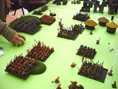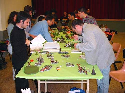 ¡El que no soporte el calor, que no baje al Infierno!... ¡Esto va en serio, señores!. El brillo en los ojos de los vencedores al observar el despliegue de sus respectivos adversarios y la tensa serenidad de los menos agraciados, dispuestos a vengar la afrenta de la primera batalla, daba motivos para pensar que la 2ª ronda iba a ser tanto o más interesante que la primera; duelos jugosos (el Juicio de Honor entre Luis Sanz y José Vilaseca, ambos Bretonianos, en la mesa estrella, o la hermosa estampa de dos ejércitos impresionantes como los de Javi Gayet -Enanos- y Toni Martínez -Ídem del Caos-), y mucho por jugar; si alguien había olvidado calentar los dados, quizá había llegado un poco tarde...