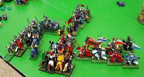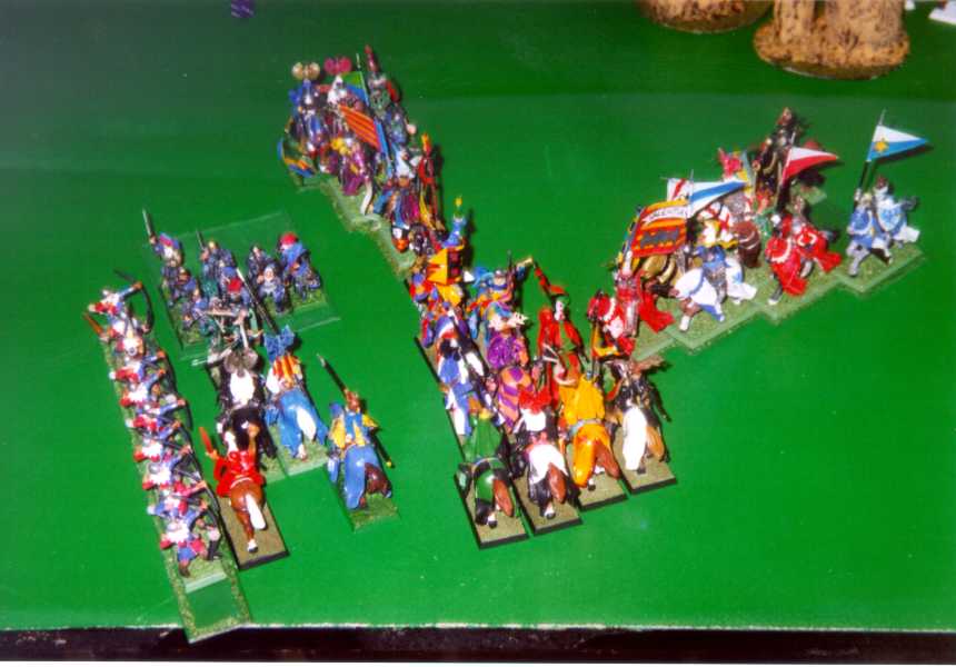Cargaron las dos unidades de Caballeros del Reino (la más grande, con Estandarte del Valor), así como los Arqueros y los Hombres de Armas... ¡Conquista o muerte!. La unidad de la derecha sufrió cuantiosísimas bajas, y, a pesar de que la más pequeña -izquierda-, aguantó e incluso hizo huir a los diestros Espadachines bretonianos de Vilaseca, el posterior chequeo de pánico al comprobar que sus compañeros habían sido masacrados provocó una segunda huida, que dio con dos de las más grandes unidades de Luis fuera del terreno de juego... ¡Y con la balanza inclinada (y así se mantuvo hasta el final de la partida), del lado de José Vilaseca)
