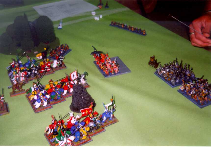 ¡Cuantos kilates en las primeras mesas!. Todas las batallas fueron auténticas finales; cierto que en enfrentamiento entre Rafa Masot y José Vilaseca tuvo un sabor especial: Se dieron un abrazo antes de comenzar, sabedores que entre los dos se iba a decidir uno de los mejores puestos. Rafa nunca había vencido a José anteriormente, pero al final la fortuna le sonrió: Sin embargo, hay que decir que, después de un Cometa de Casandora lanzado con fuerza irresistible en el turno 1 (que no logró impactar en 2 unidades de Caballeros de Rafa, y que hubiera supuesto un chorro de bajas definitivo), y tras una carga (en la imagen), lastimosa por parte de las unidades de Caballeros del Reino de Vilaseca, poco o nada pudo hacerse; por otro lado, Arqueros y Hombres de Armas resultaron mucho menos heróicos que en la partida contra Luis Sanz y, cuando ya habían ocupado en objetivo, huyeron de forma sorprendente, dejando desguarnecido el flanco izquierdo, dando al traste con las esperanzas de victoria del Señor de Vilaseca... ¡Otra vez será!.
