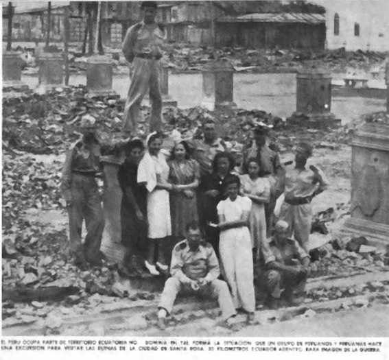 EL PERÚ OCUPA PARTE DEL TERRITORIO ECUATORIANO DOMINA EN TAL FORMA LA SITUACIÓN QUE UN GRUPO DE PERUANOS Y PERUANAS HACE UNA EXCURSIÓN PARA VISITAR LAS RUINAS EN LA CIUDAD DE SANTA ROSA 35 KILÓMETROS ECUADOR ADENTRO RARA IMAGEN DE LA GUERRA |