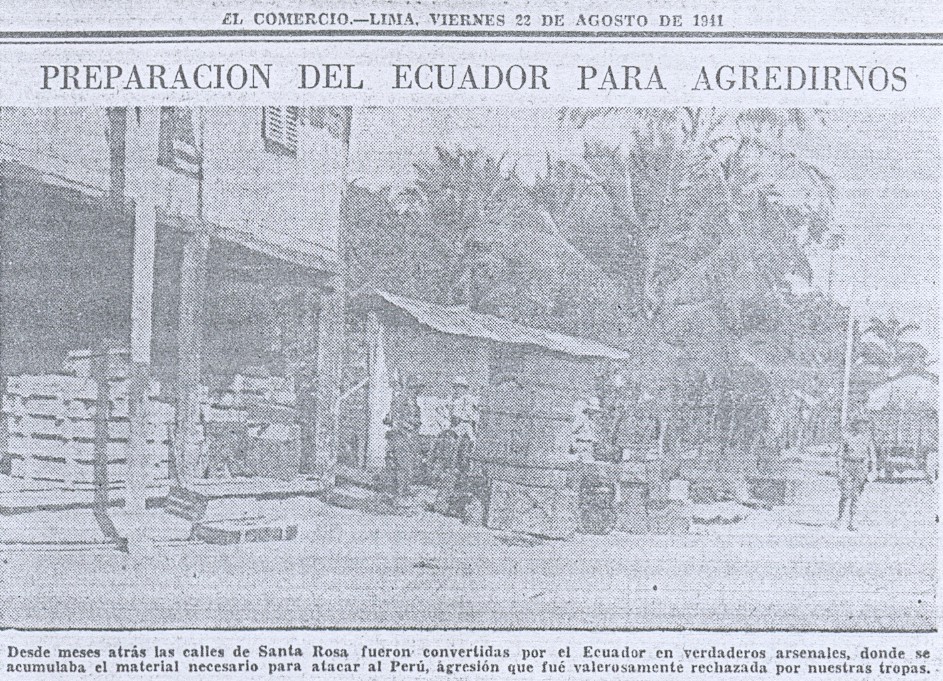 En esta foto histórica, que vale mas que una infinidad de palabras, se puede observar claramente la cantidad de cajones de munición dentro y fuera de las casas de la ciudad ecuatoriana de Santa Rosa en 1941, esta foto es una prueba que demuestra que el ejercito ecuatoriano ocultó este arsenal en el interior de esa ciudad exponiendo a sus propios civiles. |