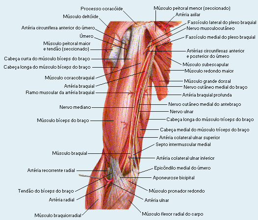 A art�ria subcl�via (direita ou esquerda), logo ap�s o se in�cio, origina a art�ria vertebral que vai auxiliar na vasculariza��o cerebral, descendo em dire��o a axila ela, a subcl�via, recebe o nome de art�ria axilar, e quando finalmente atinge o bra�o seu nome muda de novo mas agora para art�ria braquial (umeral). Na regi�o do cotovelo ela emite dois remos terminais que s�o as art�rias radial e ulnar que v�o percorrer o antebra�o. Na m�o essas duas art�rias se anastomosam formando um arco palmar profundo que origina as art�rias digitais palmares comuns e as art�rias metacarpianas palmares que v�o se anastomosar.