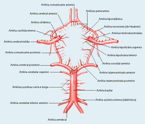 As art�rias cerebrais posteriores se comunicam com as arteriais car�tidas internas atrav�s das art�rias comunicantes posteriores.