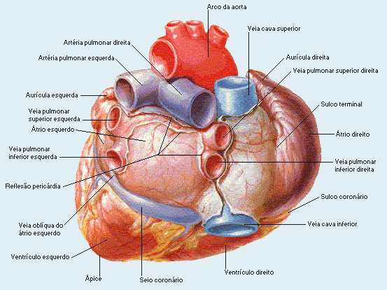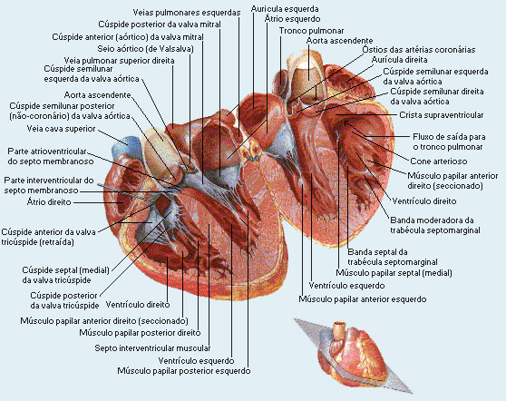 Configura��o Interior: o �trio direito comunica-se com o ventr�culo direito e o esquerdo com o ventr�culo esquerdo atrav�s do �stio atrioventricular, assim podemos dividir o cora��o em duas partes distintas: a esquerda onde circula s� sangue arterial (oxigenado) e a direita onde transita sangue venoso (rico em g�s carb�nico).