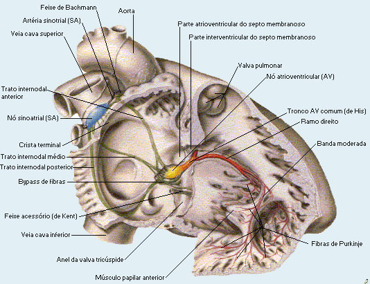 ������������������������3- Fasc�culo atrioventricular: origina-se do n� atrioventricular e se dirige para o septo interventricular, ao n�vel do qual se bifurca em dois ramos, um direito que desce pelo lado direito do septo interventricular, e outro esquerdo que perfura o septo, para descer pala sua face esquerda.