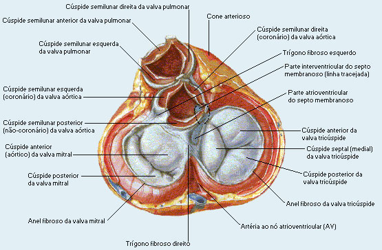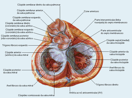 No �stio atrioventricular esquerdo encontramos a valva atrioventricular esquerda, constitu�da apenas por duas laminas denominadas c�spides d�-se o nome a essa valva de bic�spide.