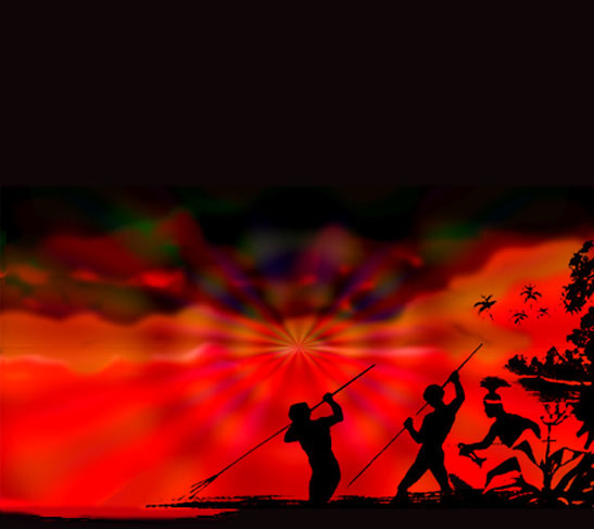 | But Mein - djala was fainting - weak; He struck the stone: "Food, food I seek!" "Old man send me a snake" he cried; The Umbe stone in kind replied. For as he spoke a snake he saw; Then snakes, and on came more, and more. He moved to get a stick, alas! They blocked his path; he could not pass. He tried to dodge; they hemmed him round; They forced the hunter to the ground. A writhing mass of snakes was there; He cried aloud in his despair. He fought and struggled hard for breath As he was slowly crushed to death. And Mein - djala was no more - Just a warning gone before Thus all who imitate the great, Will likewise meet a dreadful fate. |