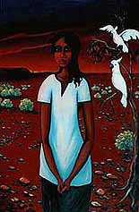 | "The red horizon merges into sky ... And shows the eye reality's a lie. The lonely wind makes brown acacias sigh, To tell the ear that silence, too, must die". |