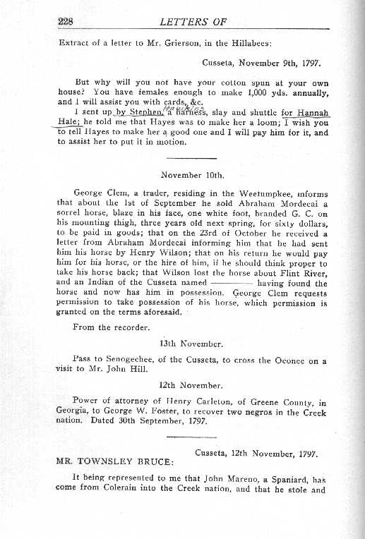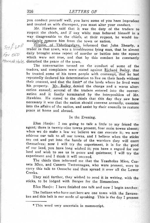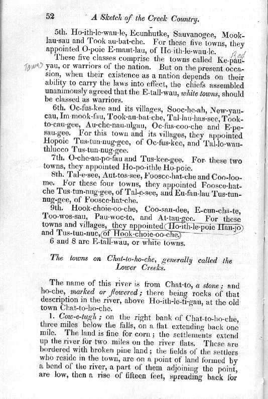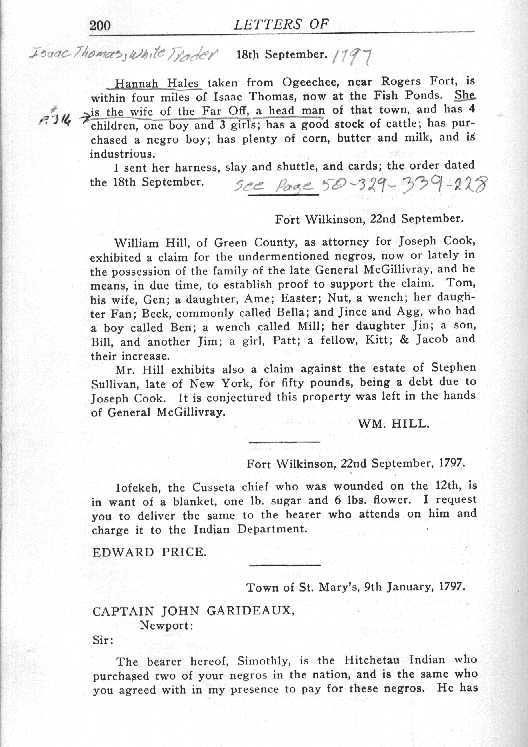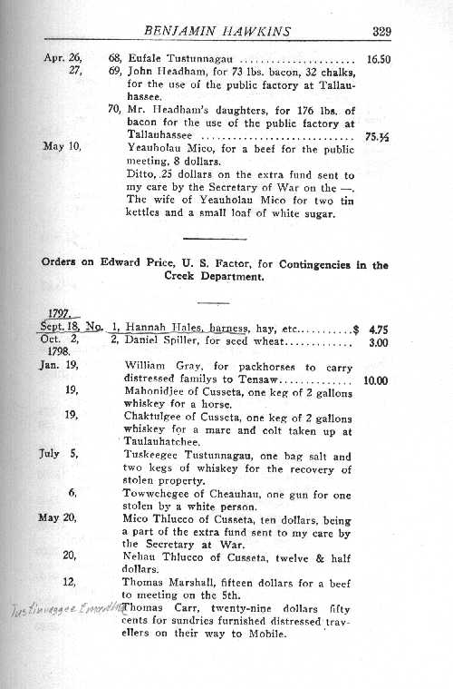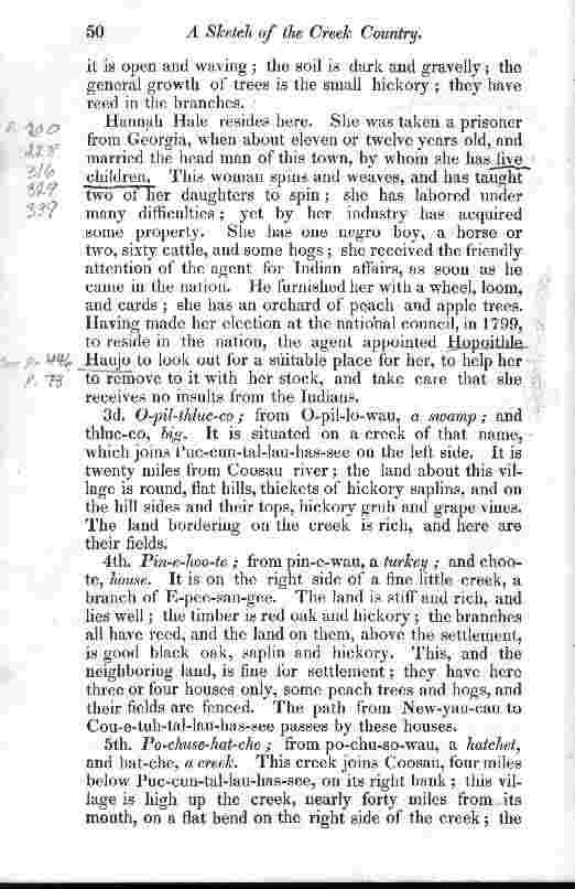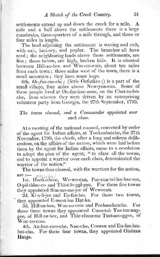 The following pages will define exactly who Hoithlepoia Haujo was. Hawkins plainly says this man was from the town of Hookchoieooche.(p52) The towns he was appointed to govern are Alabama Towns. The town named Ataugee is the mother town of the Alabama Tribe. It is very clear that he is not the same as Hopia of the Fish Ponds. In 1799 when Hawkins appointed him to move Hannah and her family to a safe place he gave her the land on the Alabama River. This land was in possession of the Alabama Tribe. The Hookchoie (Okchia) Indians were predominately Alabama. These facts strongly indicate that Far Off of the Fish Ponds was an Alabama.