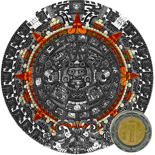 Esta moneda está formada por 2 metales diferentes, y se compone, sobre el metal exterior, de una frisa del calendario Azteca que representa los puntos cardinales e intercardinales.