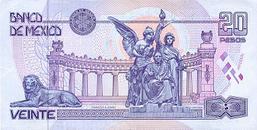| Estos billetes de 20 pesos fueron puestos en circulación para sustituir a las monedas de 20 pesos. Benito Juárez (1806-1872) está representado sobre el anverso del billete, y sobre el reverso, el hemiciclo de Juarez, monumento situado al centro de México. | |