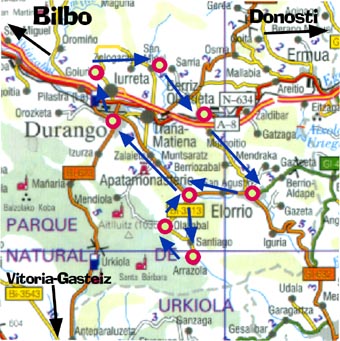 Una vez subidos al automóvil, nos encaminamos hacia Iurreta, población cercana a Durango para subir a Goiuria, una barriada de caseríos desde la que se observa una magnífica vista de los alrededores y donde se puede papear de lo lindo en cualquiera de los dos restaurantes que hay. Ikuspegi . Asador Goiuria Subiendo por la misma carretera y tras recorrer unos pocos kilómetros llegaremos a Garai, idílico pueblecito situado en un alto a los pies del monte Oiz donde nos podemos meter al cuerpo un buen choricito de la casa en la herriko taberna, restaurante ubicado en los bajos del ayuntamiento del pueblo. |