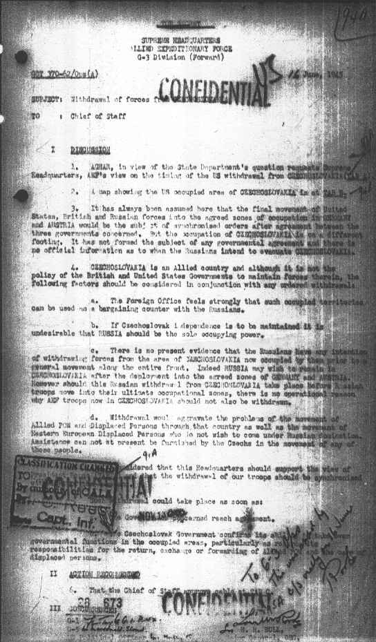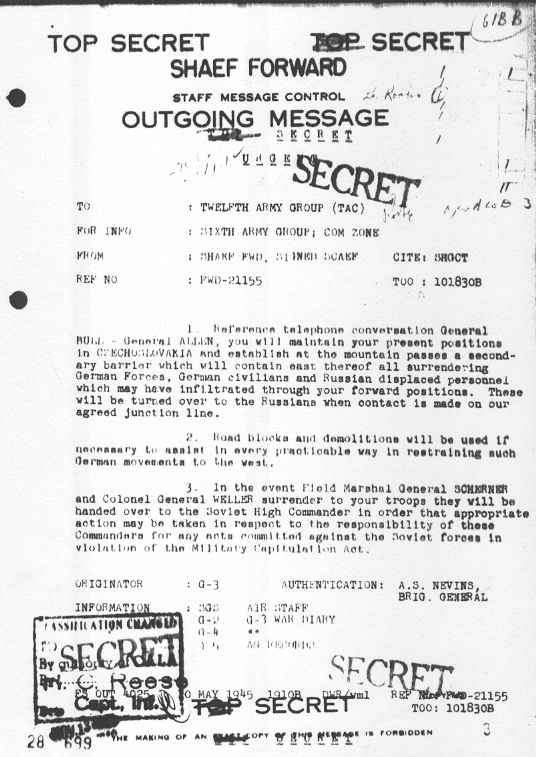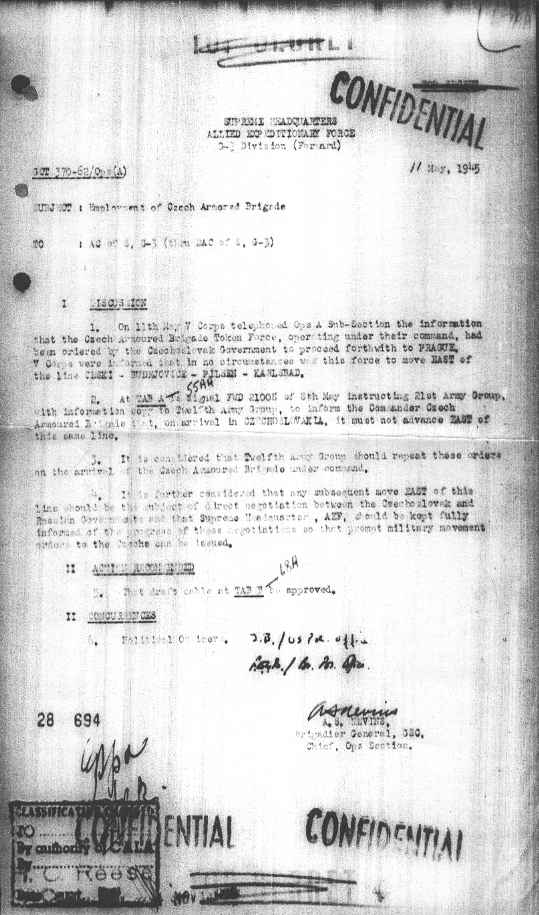 the "Present Front Line", and not the fixed, post-hostilities, demarcation line. Overall the map gives the impression of showing the position of maximum American advance between Písek and Karlovy Vary , corresponding to the 7th or 8th May, from which they later withdrew in places to the demarcation line agreed with the Soviets. However, the information shown for the areas to the west and south-west of České Budějovice, and for north of Sokolov, is several days older and does not show the 'up to date' position of the American front line as it was at the end of hostilities on the 8th/9th May.. On May 11th Stephenson and Sítek were at V.Corps HQ by 09.00hrs, but found that there was still no reply from Army command. They immediately phoned through to Army only to be told that no satisfactory answer was likely to come through their channels. It was suggested that they contact SHAEF direct. The G3 (Operations) Officer of V.Corps HQ was able to get through to SHAEF only with difficulty and after a delay. This officer then explained the situation, requesting that the Token Force be released to go to Prague, with Stephenson listening on another phone. The reply was 'No', they were to stay on the American side of the line and not to cross it. This was quite definite and a great disappointment. Records from "SHAEF G-3 Ops 'A'" have a message sent later the same day from an "A.S. Nevins, Brigadier General, GSC, Chief, Ops Section" at "SHAEF G-3 Division (Forward)", to the "AC of S, G-3 (thru DAC of S, G-3)". This seems to be as a direct result of the telephone call from V.Corps. It confirms that the Token Force was ordered NOT to go to Prague and mentions the need for the ban on troop movements crossing the demarcation line agreed with the Russians to be emphasised to the Czechoslovak Brigade on the arrival of the main body in Czechoslovakia. The first paragraph reads as follows.