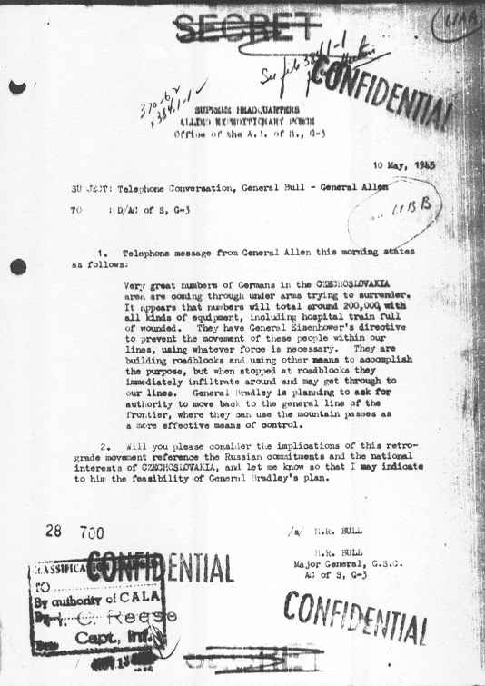 All arrangements to depart the next morning were made, and Lt.Col. Sítek ordered that the column should leave Kyšice at 10.00hrs so that there would be plenty of time to catch up with it after leaving V.Corps HQ with the release. 9. Situation in the American zone On the 9th May thousands of prisoners had started to arrive in Plzeň from all directions, along with long columns of civilian refugees. The men of the Token Force were employed in controlling them and helping with the language problems. Some indication of the conditions may be understood from a telephone call made on the 10th by a General Allen to Major-General H.R. Bull (AC of S, G-3) at SHAEF, and the resulting message from Major-General Bull to D/AC of S the same day. It refers to the severe problems with personnel infiltrating the American lines from East to West, and the intention of General Bradley (commander of 12th Army Group) to ask for permission to withdraw to the line of the Czechoslovak border, in more mountainous terrain, allowing better control and prevention of this movement. CLICK HERE TO SEE A COPY OF THE