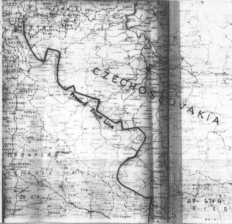 FROM EISENHOWER TO BRADLEY (65KB) Much later, on 16th June, General Bull sent a message to the Chief of Staff concerning the eventual withdrawal of American forces from Czechoslovakia. Attached to it was a map which was stated as showing the area of Czechoslovakia occupied by the US. However, close inspection of the front line drawn on the map indicates that it is not contemporary with the message, but in fact shows the approximate front line just before the end of hostilities. The position shown is possibly that on the 7th or 8th of May (with some areas using information a day or two older), the time when the Token Force had arrived in Plzeň and were seeking permission to continue to Prague.