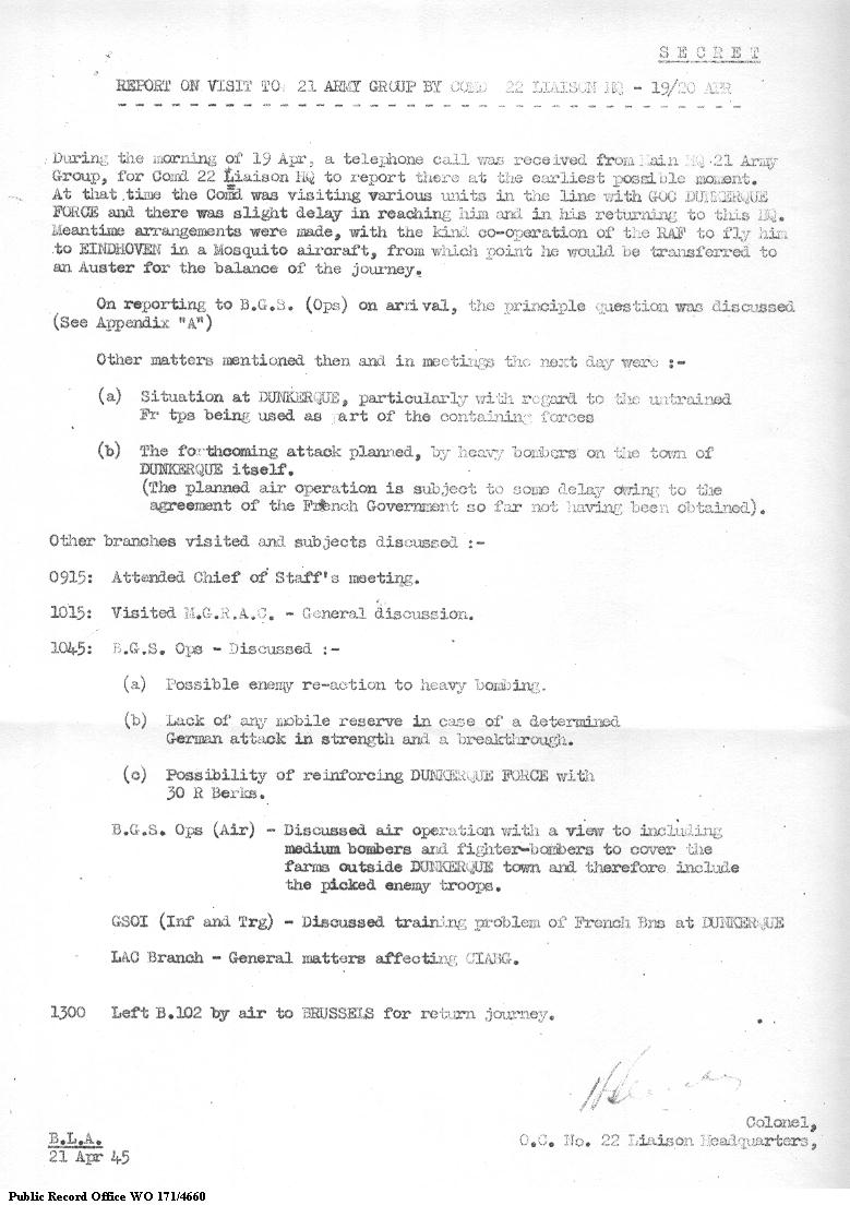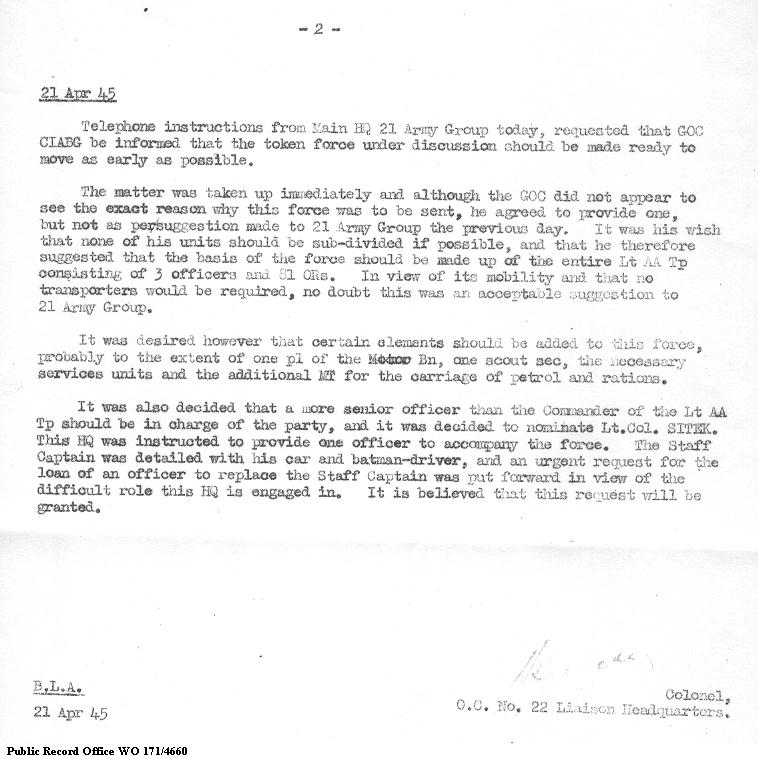 Shortly after receipt of the movement order from HQ 21 Army Group, a message was sent at 14.57hrs 22nd April by 22 LHQ as requested giving the final composition of the Token Force.