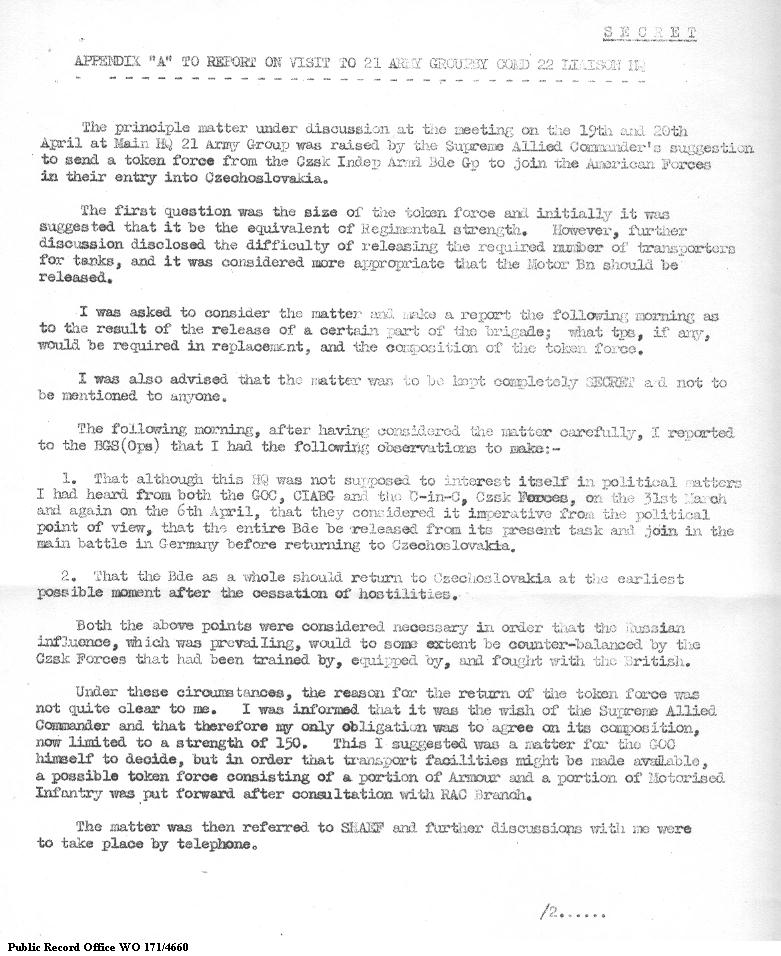 1. The CIABG, 22 LHQ and Dunkirk The Czechoslovak Independent Armoured Brigade Group (CIABG) was formed on 1st September 1943 from the original Czechoslovak Brigade with a strength of 194 Officers (with another 207 un-posted Officers surplus to requirements) and 2,365 Other Ranks, plus the men of a newly arrived transport of Czechoslovaks who had been serving in the Middle East and North Africa (including the siege of Tobruk), consisting of 48 Officers and 1,274 Other Ranks. The average strength of the new CIABG in September 1943 was 245 Officers, 129 unposted Officers, and 3,659 Other Ranks. They re-equipped and trained extensively in Britain before being sent to mainland Europe at the end of August 1944. After waiting for more than a month just to the north-east of Falaise they were then not used on the main front, but instead took over the siege of the isolated German garrison in Dunkirk from October 1944 as part of Montgomery's 21 Army Group. No.22 Liaison (Czech) HQ, also known as just 22 LHQ or 22LHQ, was formed in August 1940 at Cholmondeley Camp, the reception centre for Czechoslovak soldiers evacuated to Britain with the fall of France. Its job was to ease relations between the new Czechoslovak Brigade being formed and the British higher command and other units. It remained embedded with the Brigade HQ throughout the war, up to and including its transfer to Czechoslovakia in May 1945. With the end of the war quickly approaching in the spring of 1945, Czechoslovak politicians and senior Officers were very keen for the CIABG to be released from their duties at Dunkirk to take part in the fighting in Germany before their return to their homeland, and many representations were made through various channels to try and achieve this aim. On 4th April 1945 the AA&QMG, LAC, HQ 21 Army Group visited 22 LHQ near Dunkirk and lunched there. In the afternoon he had a brief meeting with the GOC CIABG (General Officer Commanding - General Liška). The object of the visit was to explain that everything possible had been done to obtain the CIABG's release from Dunkirk, but that operational requirements did not make it feasible at that time. While the GOC CIABG appreciated this, he left the AA&QMG in no doubt as to the contingent's eagerness to get on the move towards their own country and to have the opportunity of participating in the war inside Germany. The 'operational requirements' referred to involved the concerns of the British about finding troops to replace the CIABG at Dunkirk, along with American concerns about supply and maintenance of units with British equipment while attached to American forces. 2. A meeting at 21 Army Group Main HQ In the morning of 18th April 1944 American troops crossed the line of the pre-war border from Germany into Czechoslovakia, taking the village of Hranice north of Aš. At 11.30hrs on the 19th there was a telephone call from 21 Army Group to 22 LHQ with an urgent requirement for the CO (Commanding Officer - Colonel H. Bleecker) to fly immediately to the main 21 Army Group HQ. At that moment the CO was visiting various units with the GOC Dunkirk Force (General Liška), so there was a short delay in reaching him and in his returning to his HQ. Meanwhile, arrangements were made for him to fly by Mosquito aircraft from the Coxyde airfield to Eindhoven, and then onwards by Auster. He left at 14.00hrs and returned from his trip the next day at 18.45hrs. Although there were a number of minor things mentioned during the CO's meetings spread over the two days, the first and principle matter under discussion with the BGS (Ops) was the suggestion by the Supreme Allied Commander that a token force be sent from the CIABG to join American forces on their entry into Czechoslovakia. The first question was the size of the force. Although it was originally suggested it be of regimental strength, after discussions which showed the difficulty in obtaining the required number of tank transporters it was considered more appropriate that the Motor Battalion be released. Colonel Bleecker was asked to consider the matter overnight and report the next morning as to the effect of the release on the Brigade, what troops might be needed as replacements, and the composition of the token force. He was also advised that the matter should be kept completely secret and not be mentioned to anyone. Having considered it carefully, the next morning he reported to BGS (Ops) that he had the following two observations to make. First, that although he was not supposed to be interested in political affairs, he had heard several times from senior Czechoslovak officers that it was considered imperative from the political point of view that the entire Brigade be released from Dunkirk and take part in the main fighting in Germany before its return to Czechoslovakia. Second, that the Brigade as a whole should return to Czechoslovakia as soon as possible after the end of hostilities. Both these points were considered necessary to balance the prevailing Russian influence with British trained and equipped Czechoslovak forces. Under those circumstances the reason for sending the token force was not clear to him. In answer to this, Colonel Bleecker was told that it was the wish of the Supreme Allied Commander and that he was only required to agree the composition of the force, now limited to 150 men. In return, Bleecker suggested that this was a matter for the GOC CIABG to decide, but that sending part of the armour and part of the Motorised Infantry might be considered. The matter was then referred to SHAEF (Supreme Headquarters Allied Expeditionary Force) and any further discussions with Bleecker were to take place by telephone. He then returned to 22 LHQ near Dunkirk. At 09.00hrs on 21st April 1945, the day after Bleecker's return, Main HQ 21 Army Group telephoned him and requested that the GOC CIABG be informed, and that the token force under discussion should be ready to leave as soon as possible. The d