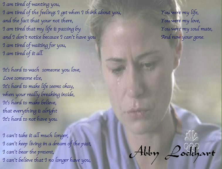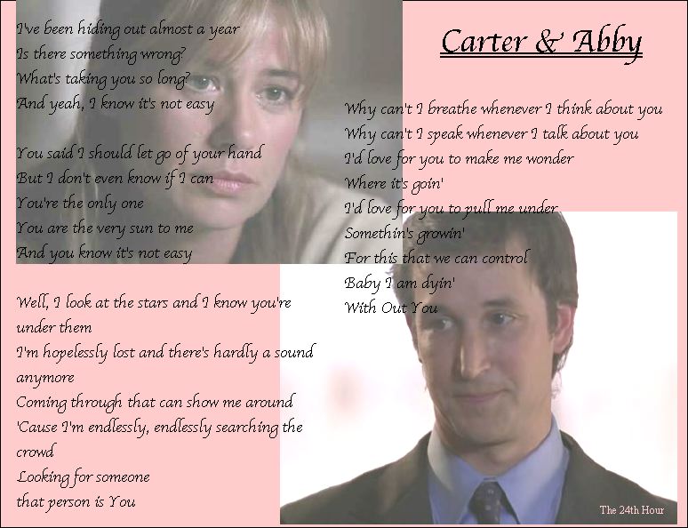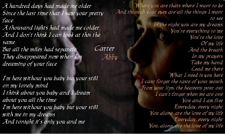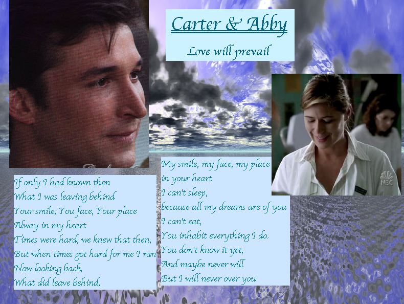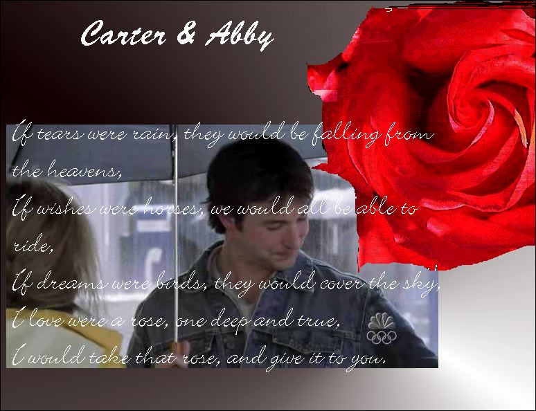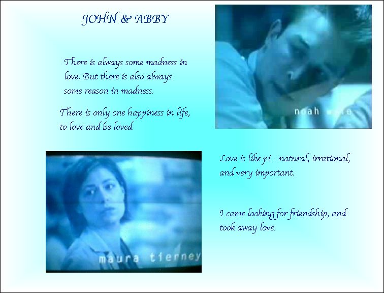 | Main Menu Home Bios Maura Tierney Abby Lockhart Noah Wyle John Carter Carby Relationship Recap Pictures Quotes FanArt "Dear Abby" Letter Screen Caps Misc ER Links |