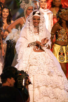 En la gráfica de Reuters es apreciada cuando desfilaba su traje típico en el escenario del Universe Center, que despertó muy buenos comentarios y quedó como primera finalista.