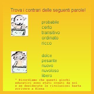 piaccia a tutti e… fatemi sapere!! Grazie Daniela… x il sito! Partiamo insieme per questa avventura che ci porterà alla scoperta di un mondo che magari può sembrare noioso...ma sarà divertente percorrerlo insieme! Se avete bisogno del mio aiuto per la scuola o per i compiti delle vacanze... eccomi: sono qui per voi. Se siete semplicemente curiosi... eccomi qui lo stesso! In questa pagina del sito di Daniela, come dicevo, potrete chiedermi aiuto oppure leggere temi svolti da cui prendere spunto oppure vedere le nostre spiegazioni su alcuni argomenti o su alcune materie scolastiche che voi mi chiederete. Se avete suggerimenti... Avanti!! Ora, parlando con le mie coetanee,vorrei scambiare quattro chiacchiere qui anche con chi vorrebbe intraprendere la carriera dell'insegnamento come me. Cosa ne pensate? Potreste aiutarmi in questo sito mandandomi una e-mail.