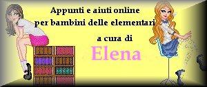 Ciaoooooooooooooooooo a tutti!! Sono Elena, ho 14 anni e frequento il Liceo Socio Psico Pedagogico. Vorrei fare la maestra delle elementari (speriamo!) Proprio x questa mia passione x i bambini, ho deciso, insieme a Daniela, di creare questa sezione per i bimbi delle elementari. Inoltre io adoro fare lavoretti manuali e creativi… e… nuotare; ho 1 cane (Niky) e 1 gatto (Pepe), tutto arancione e minuscolo e 3 fratelli. Sono nata il 30 Luglio 1990 e sono abbastanza brava a scuola. Fisicamente sono alta, magra, con i capelli biondi e con gli occhi azzurri. Spero che questa pagina