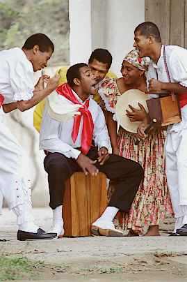 Musicians enjoy playing the caj�n, a Peruvian-originated drum instrument, as dancers interpret the "Alcatraz" dance.
